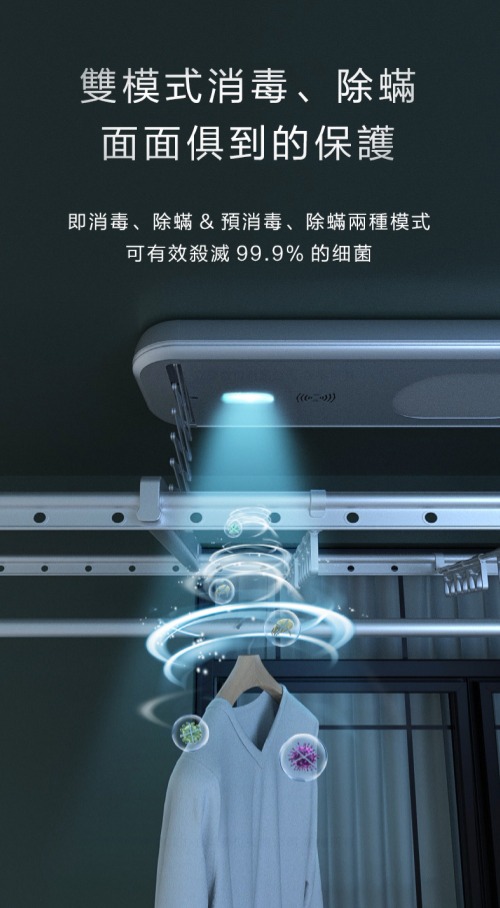 預除螨:預約8小時候啟動殺菌,連續工作37.5分鐘後自動關閉風乾 - 暖風 - 同步曬 - 3D晾 - 異常警報 上/下限位開關故障警報