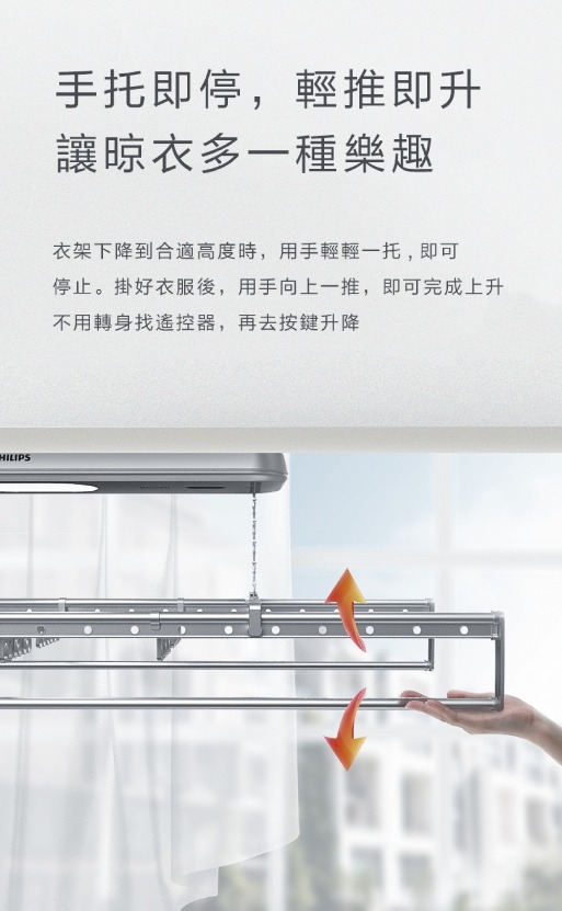 掛好衣服後,用手向上一堆,即可完成上升不用轉身找遙控器,再去按鍵升降。